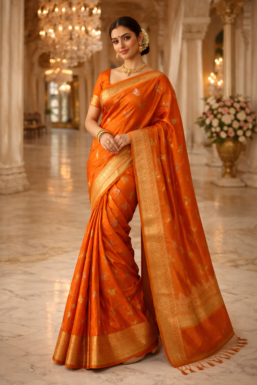 Elevate your traditional style with this stunning orange silk saree featuring intricate zari weaving and elegant motifs. Designed with a rich golden border and luxurious texture, this saree reflects timeless Indian craftsmanship. Perfect for weddings, festivals, and special occasions, it offers a graceful and sophisticated look.
